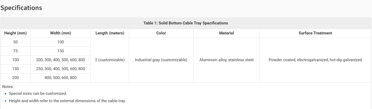 Solid bottom cable tray is a fully enclosed type of cable tray , its hole-free flat bottom design effectively prevents dust, water droplets, and other impurities from damaging the cables. It is suitable for laying computer cables, communication cables, thermocouple cables, and other highly sensitive system control cables. Besides, it provides good protection against interference shielding for control cables and in heavily corrosive environments.